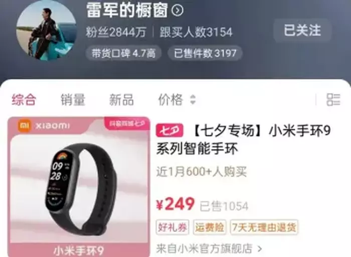 近日,在雷军个人抖音橱窗,一款标价249元的“小米手环9系列智能手环”悄然上线,用户可以通过抖音直接下单。和小杨哥费力吆喝不同,雷军本人并未卖力直播,这或导致该款小米手环的销量并不理想,只销售了千余件。让网友意外的是,雷军的橱窗很快变为0件物品,原先售卖的产品已经悄然下线,这是否为雷军的一次试水引发网友讨论。