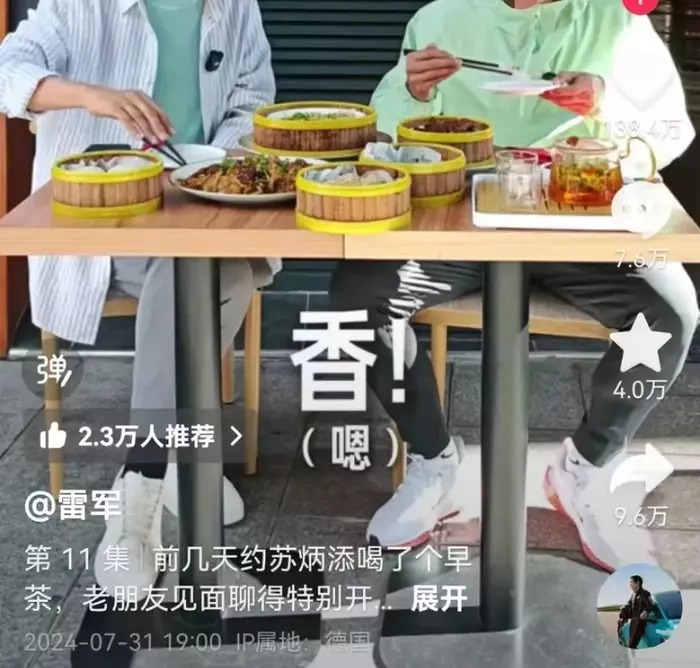 巴黎奥运会期间,雷军约苏炳添吃早茶,在直播间的饭桌上雷军和苏炳添侃侃而谈,大谈早茶文化。雷军说他们湖北人没有辣椒很难吃得下去饭,随后像变戏法一样拿出一瓶自带的辣椒酱,用它来蘸虾饺吃,给苏炳添夹了一只虾饺,苏炳添吃完虾饺后的评价是一个字——香。