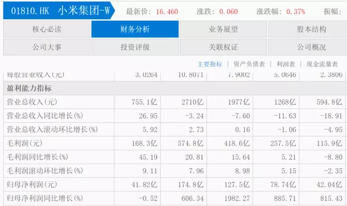 小米2024年第一季度业绩表现并不太理想。小米一季报显示,小米营收755.1亿元,同比增长26.95%;净利润41.82亿元,同比下滑0.52%,而去年同期的净利润增幅则达815.43%。