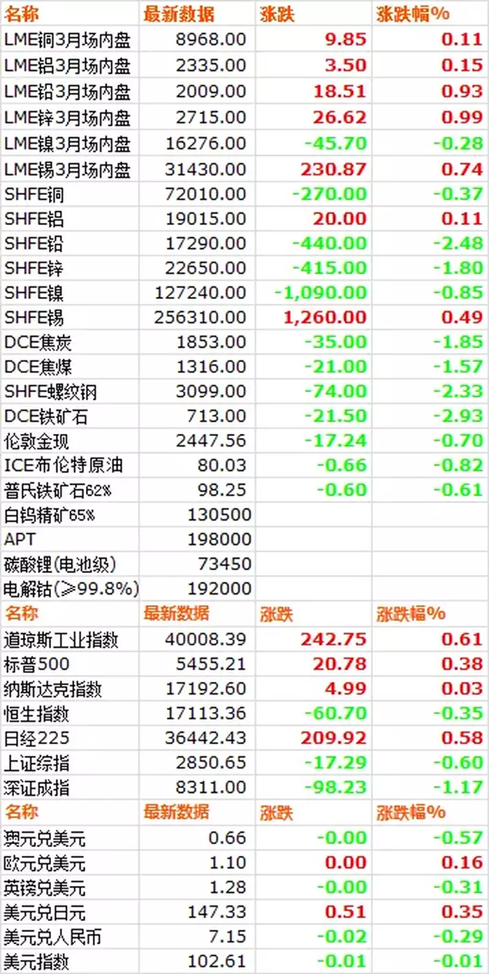 8月14日,LME六种基本金属价格涨多跌少,仅镍小幅下跌,锌领涨。三月期铜价收于8968.5美元/吨,上涨0.11%。三月期铝价收于2335.5美元/吨,上涨0.15%。三月期铅价收于2009美元/吨,上涨0.93%。三月期锌价收于2715美元/吨,上涨0.99%。三月期锡价收于31430美元/吨,上涨0.74%。三月期镍价收于16276美元/吨,下跌0.28%。