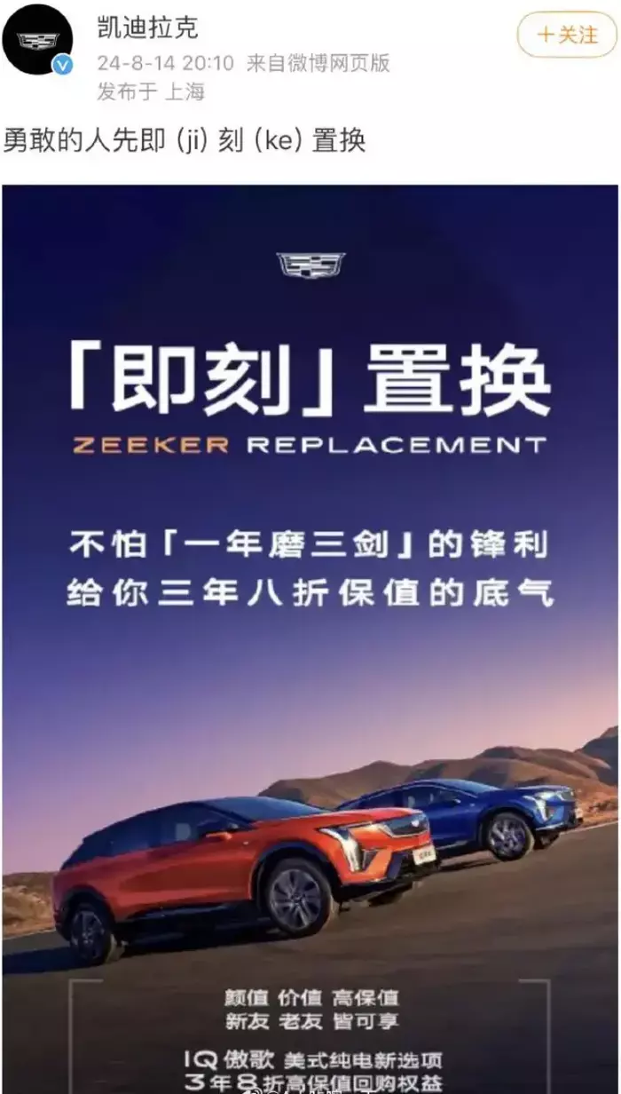 极氪的风波不仅来自老车主维权,还有友商的“落井下石”。据澎湃新闻8月16日报道,凯迪拉克在当日晚间通过官微推出“即(ji)刻(ke)置换”服务暗讽极氪半年改款2次一事。凯迪拉克的海报中直接用了ZEEKER(极氪英文名),文案“不怕一年磨三剑的锋利,给你三年八折保值的底气”,等于点名嘲讽极氪。