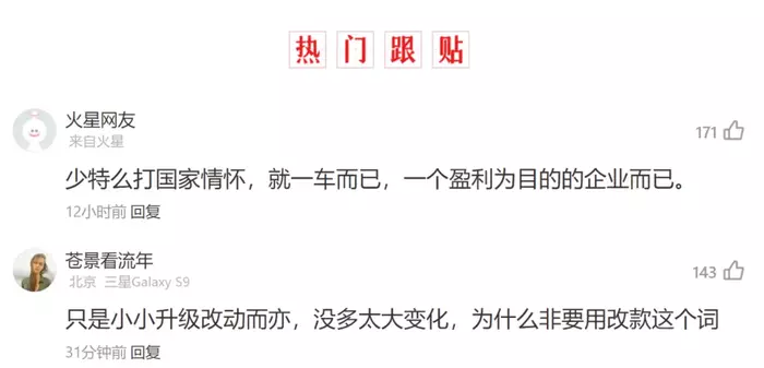 但是一些网友持不同意见称,极氪不应该打国家情怀,企业以赚钱为目的本来很正常,但打国家情怀就变了味道。还有网友质疑称极氪只是小小的升级改动而已,谈不上改款。