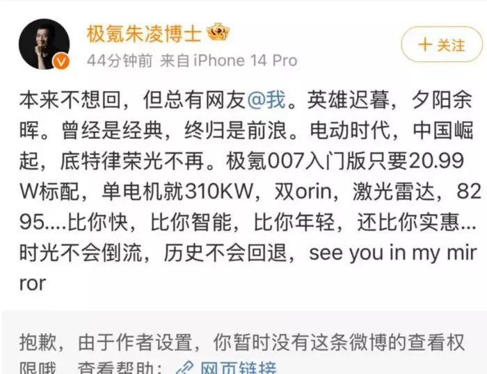 对于凯迪拉克的“嘲讽”,极氪很快作出回应。极氪副总裁朱凌在社交账号上发文,“英雄迟暮,夕阳余晖。曾经是经典,终归是前浪。电动时代,中国崛起,底特律荣光不再。极氪007入门版只要20.99W标配,单电机就310KW,双orin,激光雷达,8295……比你快,比你智能,比你年轻,还比你实惠……时光不会倒流,历史不会回退,see you in my mirror。”