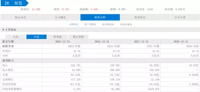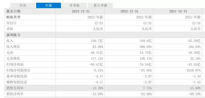 据财报显示,2021年至2023年,极氪营收分别为62.28亿元、319亿元和516.7亿元,同比增幅为104.94%、388.69%和61.99%。尤其是2022年增幅超越众多造车新势力。同期归母净利润为-43.63亿元、-79.34亿元和-83.47亿元,同比增幅为-4310.79%、-81.86%和-5.21%。