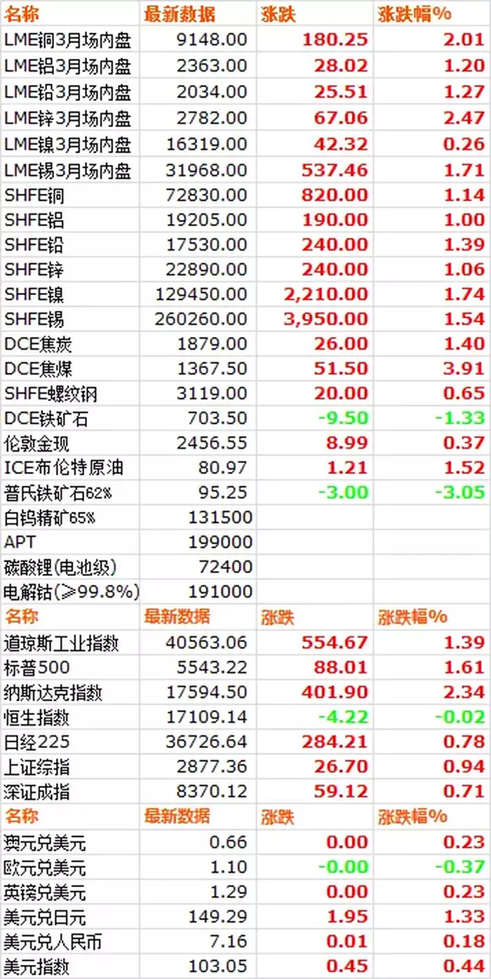 8月15日,LME六种基本金属价格全线上涨,锌领涨大盘,铜涨幅居前。三月期铜价收于9148.5美元/吨,上涨2.01%。三月期铝价收于2363.5美元/吨,上涨1.20%。三月期铅价收于2034.5美元/吨,上涨1.27%。三月期锌价收于2782美元/吨,上涨2.47%。三月期锡价收于31968美元/吨,上涨1.71%。三月期镍价收于16319美元/吨,上涨0.26%。