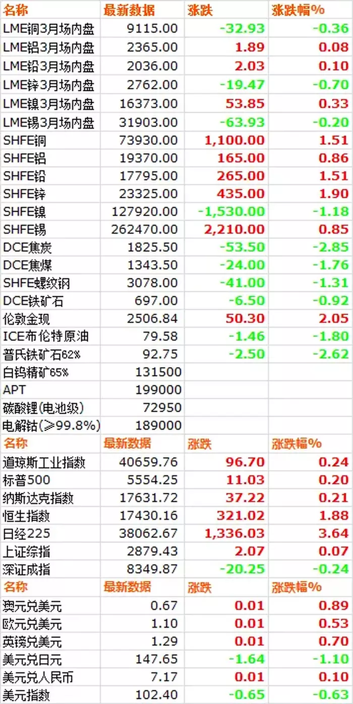 8月16日,LME六种基本金属价格涨跌互现,各品种变化幅度均不大。三月期铜价收于9115.5美元/吨,下跌0.36%。三月期铝价收于2365.5美元/吨,上涨0.08%。三月期铅价收于2036.5美元/吨,上涨0.10%。三月期锌价收于2762.5美元/吨,下跌0.70%。三月期锡价收于31903美元/吨,下跌0.20%。三月期镍价收于16373美元/吨,上涨0.33%。
