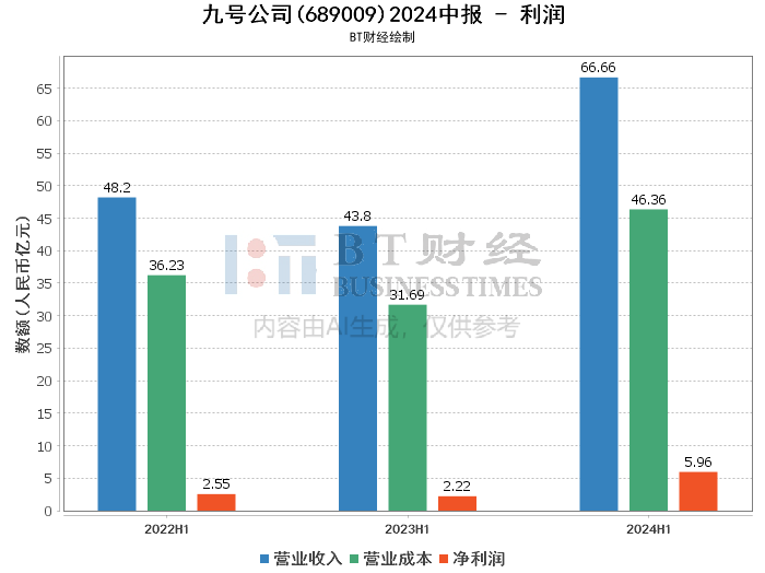 利润方面,九号公司在2024年上半年实现了营业收入66.66亿元,同比增长52.20%。营业总成本为59.64亿元,同比增长45.41%。营业利润为7.19亿元,同比增长241.28%。净利润为5.96亿元,同比增长168.34%。归属于母公司股东的净利润为5.96亿元,同比增长167.82%。这些增长主要得益于电动两轮车、服务机器人和全地形车产品销售规模及市场占有率的提高。
