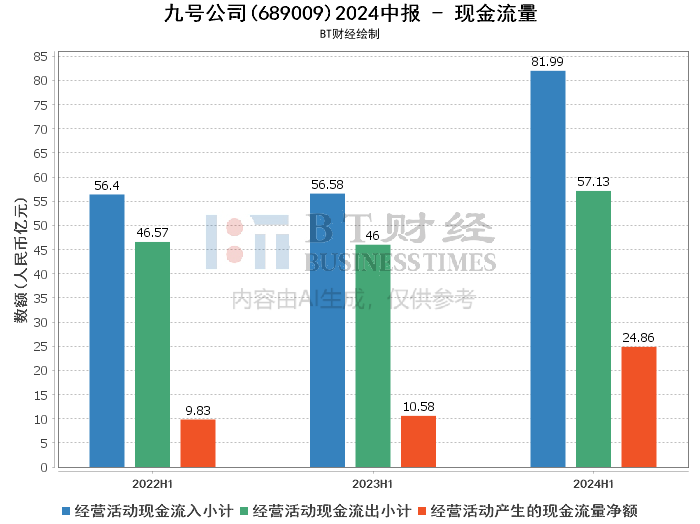 在现金流方面,九号公司经营活动产生的现金流量净额为24.86亿元,同比增长134.88%。投资活动产生的现金流量净额为-11.76亿元,同比下降320.17%,主要由于公司购买银行理财产品所致。筹资活动产生的现金流量净额为-4.92亿元,主要由于公司从二级市场回购库存股及向投资者分红所致。