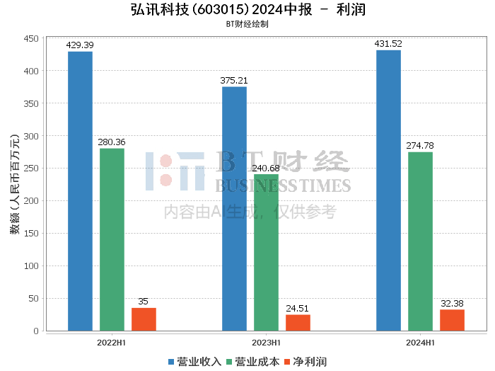 在利润方面,弘讯科技2024年上半年实现营业收入4.32亿元,同比增长15.01%。营业成本为2.75亿元,同比增长14.16%,毛利率为36.32%,较上年同期的35.85%略有上升。净利润为32.38百万元,同比增长32.07%,净利率从上年同期的6.53%上升至7.5%。归属于上市公司股东的净利润为35.95百万元,同比增长38.62%。扣除非经常性损益后的净利润为40.23百万元,同比增长88.47%。净利润的增长主要得益于工业控制类和驱动系统类产品销量的增加,以及非经常性损益项目的影响。