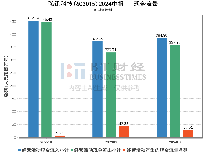 在现金流方面,弘讯科技2024年上半年经营活动产生的现金流量净额为27.51百万元,同比减少35.07%。经营活动现金流入小计为3.85亿元,较上年同期的3.72亿元增长了3.44%。经营活动现金流出小计为3.57亿元,较上年同期的3.3亿元增长了8.38%。投资活动产生的现金流量净额为19.21百万元,同比增长92.69%,主要原因是本期短期理财商品到期收回。筹资活动产生的现金流量净额为18.31百万元,较上年同期的-51.17百万元大幅增加,主要原因是本期短期借款增加。