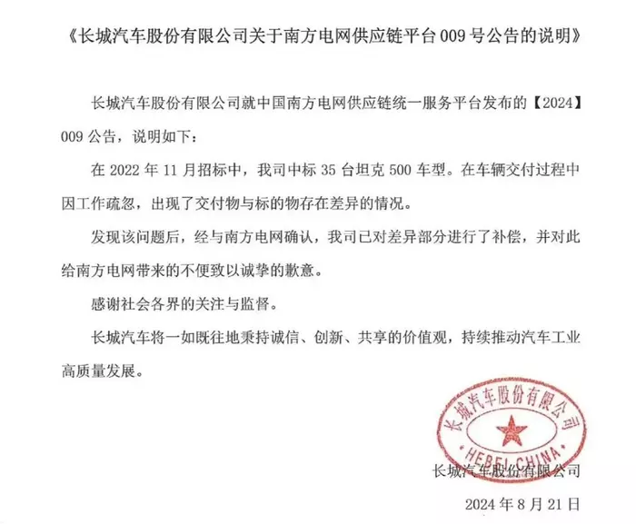8月21日,在长城汽车魏牌新车发布会的当日,长城汽车对此回应称,在2022年11月招标中,公司中标35台坦克500车型。在车辆交付过程中因工作疏忽,出现了交付物与标的物存在差异的情况。发现该问题后,经与南方电网确认,公司已对差异部分进行了补偿,并对此给南方电网带来的不便致以诚挚的歉意。