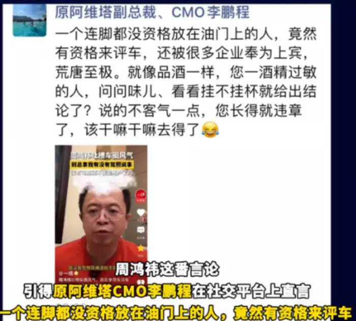 周鸿祎在车圈有一定流量,也存在一些争议。前阿维塔CMO李鹏程曾公开表示“一个连脚都没资格放在油门上的人,竟然有资格来评车,还被很多企业奉为上宾,荒唐至极。”