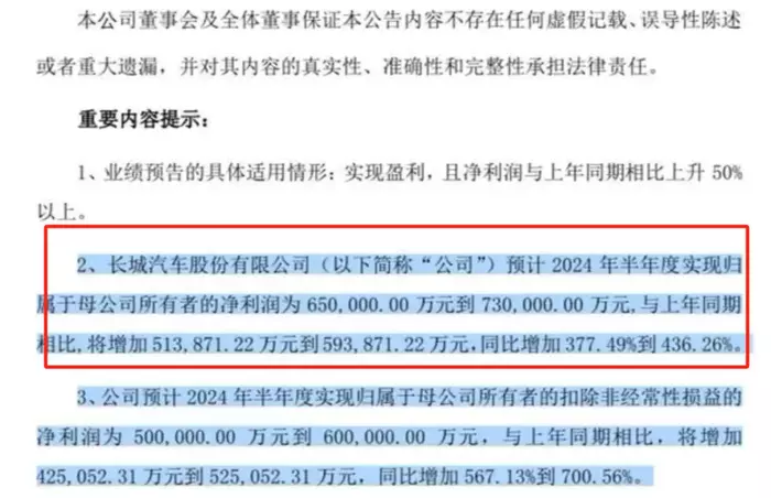 7月中旬,长城汽车发布了2024年中期业绩预告,预告显示,长城汽车2024年上半年实现归母净利润65亿元至73亿元,同比增长377.5%至436.3%,扣非后归母净利润达50亿元至60亿元,同比提升567.1%至700.6%。2024年第二季度公司单季度归母净利润中值为36.7亿元,同比增长209.4%,扣非后归母净利润中值为34.76亿元,同比增长259.6%,这一业绩表现远超市场预期。