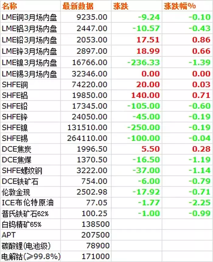 8月30日,LME六种基本金属价格涨跌互现,镍领跌。三月期铜价收于9235美元/吨,下跌0.10%。三月期铝价收于2447美元/吨,下跌0.43%。三月期铅价收于2053美元/吨,上涨0.86%。三月期锌价收于2897美元/吨,上涨0.66%。三月期锡价收于32346美元/吨,与前一日持平。三月期镍价收于16766美元/吨,下跌1.39%。