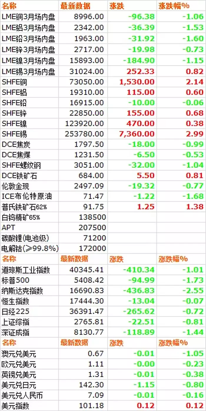 9月6日,LME六种基本金属价格跌多涨少,仅锡小幅上涨,铅领跌。三月期铜价收于8996美元/吨,下跌1.06%。三月期铝价收于2342美元/吨,下跌1.53%。三月期铅价收于1963美元/吨,下跌1.60%。三月期锌价收于2717.5美元/吨,下跌0.73%。三月期锡价收于31024美元/吨,上涨0.82%。三月期镍价收于15893美元/吨,下跌1.15%。