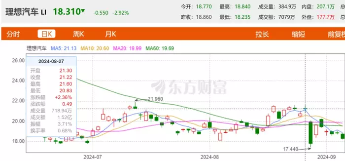 理想中报发布前一个交易日,理想收盘股价为21.22美元,截至9月6日收盘股价为18.31美元,在财报发布的7个交易日内,理想股价跌幅约14%。实时总市值为194.3亿元。而此前理想市值高点达506.1亿美元,跌幅62%。