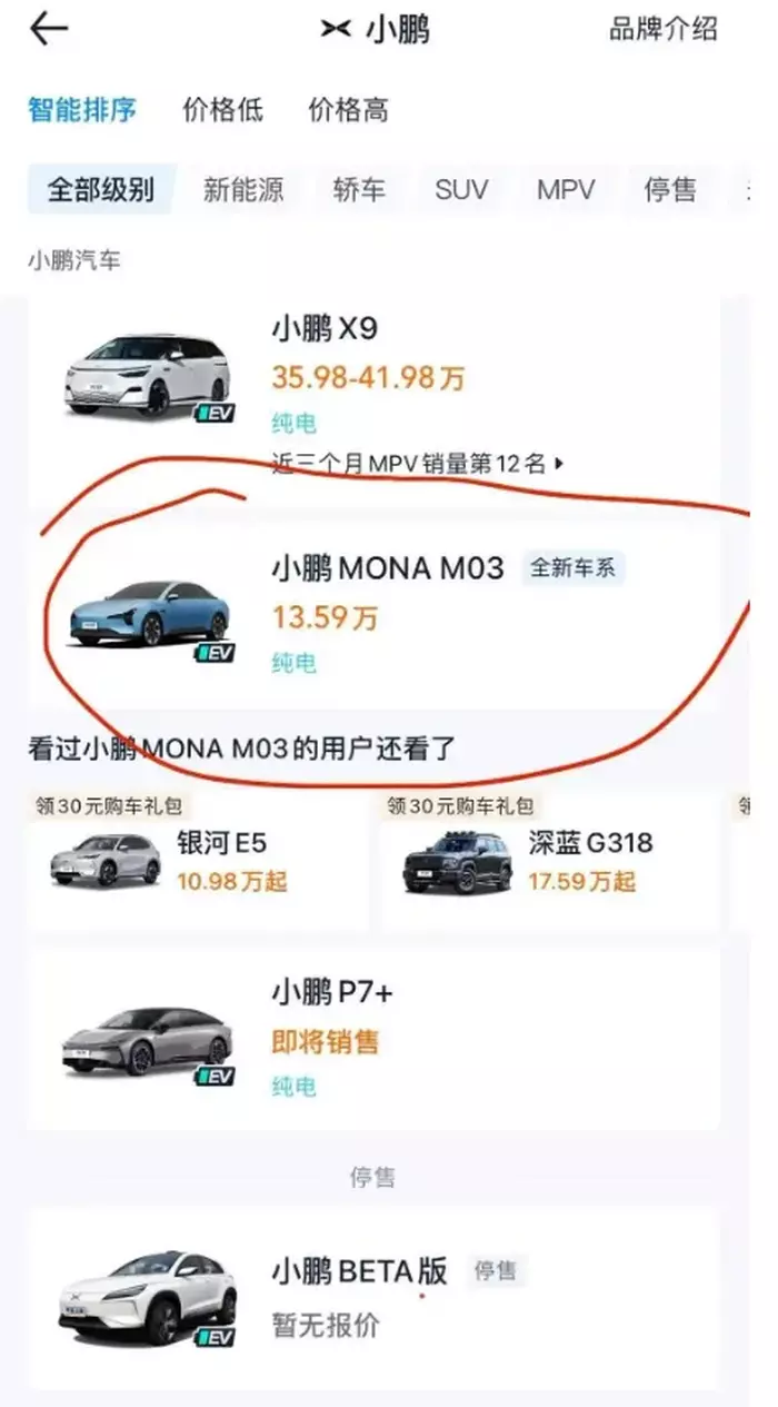 作为被何小鹏寄予厚望的一张新牌,MONA M03以全新姿态闯入竞争最为激烈的10万元~20万元价位的汽车市场,直接对标比亚迪,杀入了比亚迪后方。这个价位的新能源汽车受制于成本因素,或不会配置高阶智能驾驶,这也是小鹏MONA的核心差异化卖点,小鹏寄望其在低端市场跑量,月销量目标为1万+。