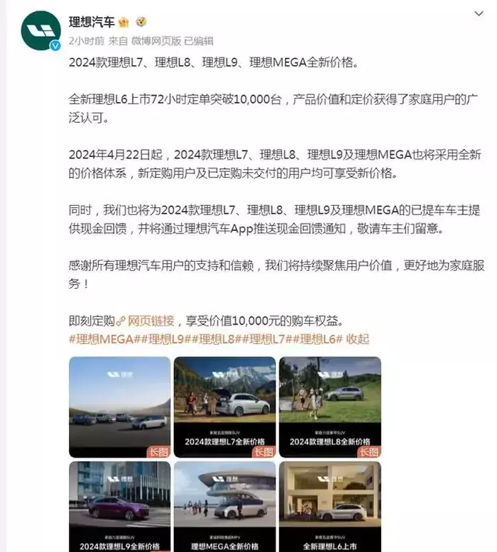 这样一来,国内主要新能源车企几乎都在降价,面对竞争对手的不断降价,理想是否选择跟进?早在4月,理想就罕见官宣全系降价,理想L6上市首次将产品线拉至30万元以下,其目的是提升市场占有率,却拉低了平均售价,这对理想上半年毛利率的下滑或有一定影响。
