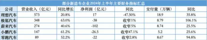 截至9月7日,已经上市(含境外上市)的5家造车新势力均已披露2024年中报,其中仅有理想一家盈利,其他小鹏、蔚来、零跑和极氪四家均处于亏损状态。