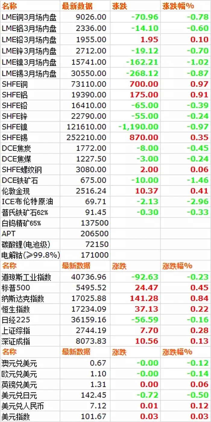 9月10日,LME六种基本金属价格跌多涨少,仅铅小幅上涨,镍领跌。三月期铜价收于9026美元/吨,下跌0.78%。三月期铝价收于2336.5美元/吨,下跌0.60%。三月期铅价收于1955美元/吨,上涨0.10%。三月期锌价收于2712美元/吨,下跌0.70%。三月期锡价收于30550美元/吨,下跌0.87%。三月期镍价收于15741美元/吨,下跌1.02%。