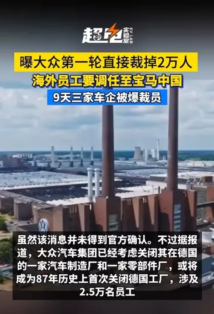9月9日有媒体报道称,德国大众汽车集团裁员,第一轮或直接裁掉2万人。报道称在大众汽车集团裁员风波下,海外员工要调任至宝马中国,直接和中国友商竞争。不过该消息目前还未得到官方确认。
