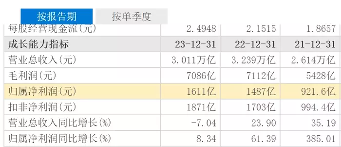 财报显示,2023年中国石油营收3.011万亿元,但同比下滑7.04%。归母净利润1611亿元,同比增长8.34%。相比此前两年35.19%和23.90%的营收增幅来说,2023年营收下滑幅度相对较大。同样此前两年净利润增幅分别为385.01%和61.39%,2023年8.34%的净利润增幅也是出现大下滑。但值得一提的是,中国石油2023年的净利率高达5.99%。相比上一年同期的5.04%提升了近1个百分点,创下了近十年净利率新高。