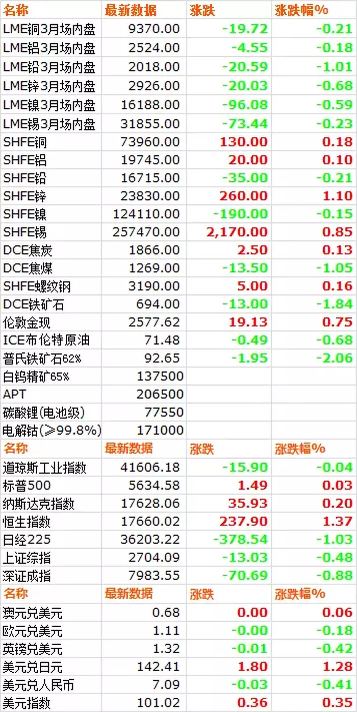 9月17日,LME六种基本金属价格全线下跌,铅跌幅居前,其他金属小幅下跌。三月期铜价收于9370美元/吨,下跌0.21%。三月期铝价收于2524美元/吨,下跌0.18%。三月期铅价收于2018美元/吨,下跌1.01%。三月期锌价收于2926美元/吨,下跌0.68%。三月期锡价收于31855美元/吨,下跌0.23%。三月期镍价收于16188美元/吨,下跌0.59%。