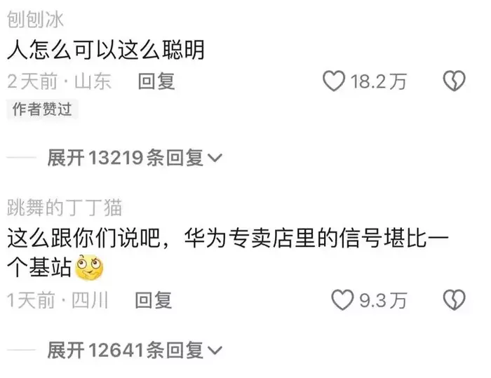 评论区更有自称是华为专卖店店员现身说法称:“店里的路由器以及宽带还有全网WIFI,那好得不是一点半点。”还有网友称,华为专卖店的WIFI信号相当于一个基站!