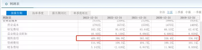 根据财报可以看出,毛利率高于美的,但6.40%的净利率却低于美的9.07%,这也直接造成海尔智家的利润规模落后竞争对手,究其原因主要是因为其销售费用高企。财报显示,2023年,海尔智家销售费用409.78亿元,占总营收的15.67%。作为对比,同期,美的的销售费用仅为348.81亿元,仅占总营收的9.33%。格力电器的销售费用为171.3亿元,销售费用占总营收的比例仅为8.36%,海尔智家的销售费用占比为三家最高。