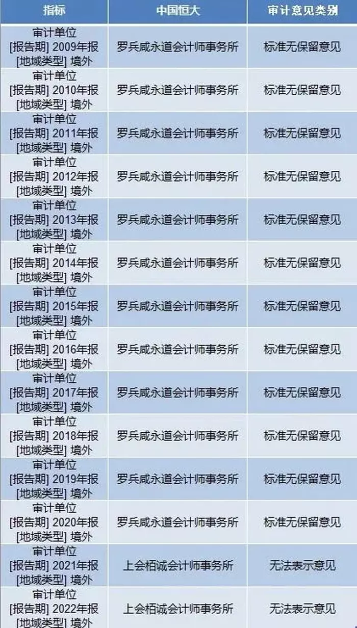 恒大和普华永道的合作始于2009年,在中国恒大暴雷之前,普华永道都为恒大出具了最高信用等级的无保留审计意见。