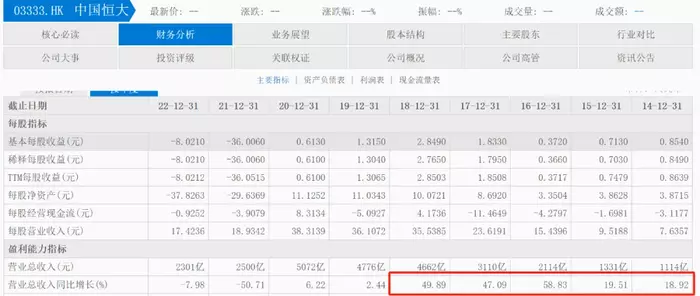 以财报来看恒大的“飞速发展历史”,多少有点蹊跷。中国房地产在2016年迎来飞跃,销售额首次突破10万亿元大关,总销售额117627亿元,同比增长34.8%。2013年恒大销售额刚破千亿,2016年恒大的销售额达3734亿元,位居行业第一。同时恒大财报显示,2014年至2018年的5年间,营收分别为1114亿元、1331亿元、2114亿元、3110亿元和4662亿元,增幅分别达18.92%、19.51%、58.83%、47.08%和49.89%,营收在此期间增加了3548亿元,创下了“高速增长”的神话。