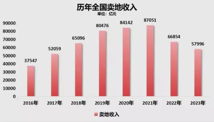 BT财经查阅2016年至2023年全国土地交易收入发现,2021年全国土地交易金额达到87051亿元,但在2022年迅速暴降至66854亿元,2023年再度下滑至57996亿元,下滑趋势明显。而在2016年至2020年,金额由37547亿元增长至84142亿元,短短5年翻了一倍有余。