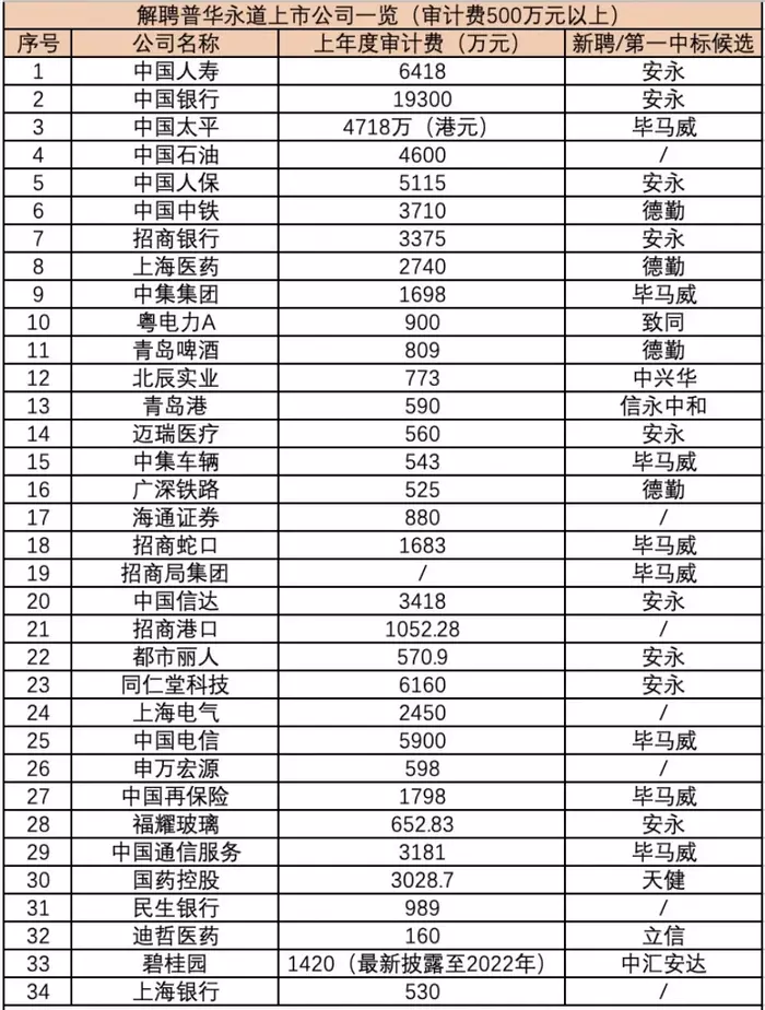 只是和续聘相比,解约的数量更多。据不完全统计,已经至少有48家上市公司改聘、取消续聘普华永道,其中上年度审计费在500万元以上的企业多达30多个。这些消失的48家客户,则成了竞争对手的客户,其中有11家公司改聘安永,10家公司改聘毕马威,8家公司改聘德勤。