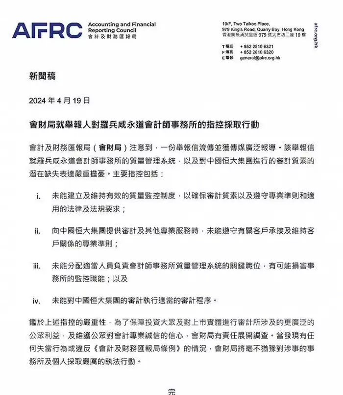 针对网上《谁把普华永道带入恒大这个火坑的?》的公开举报信,香港会计及财务汇报局于今年4月19日作出回应。称将对“普华永道审计恒大失败举报信”内容正式开启调查。公告披露,一旦发现任何失当行为或违反“会计及财务汇报局条例”的情况,将毫不犹豫对涉事的事务所及个人采取严厉的执法行动。这是监管方首次对普华永道使用了较严厉的措辞。