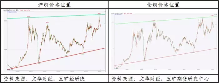 图4:沪铜和伦铜价格均处在长期价格区间中部偏高位置