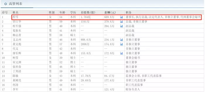 从海天味业的高管列表中还可以看到,程雪是一人兼任多个职位,除了董事长一职之外还兼任执行总裁、非独立董事、代董事会秘书以及法定代表人,也是高管中身兼职位最多的一位。
