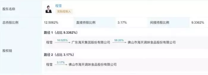 直至2014年海天味业上市时,程雪已经持有海天味业2511万股,占总股本的3.53%,并通过海天集团间接持股6.56%,合计持股比例高达10.09%。成为仅次于前董事长庞康的第二大股东,与前董事长庞康同为海天味业的共同控制人。目前天眼查数据显示,程雪持有海天味业12.51%的股份,同样仅次于庞康。