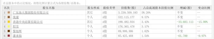 海天味业公开资料显示,前董事长庞康持股5.321亿股,程雪持股1.764亿股。其中庞康持股占比为9.57%,而程雪持股占比为3.17%,是海天味业股东构成中唯二持股比例高于3%的个人。也是和广东海天集团股份有限公司和香港中央结算有限公司一起4个持股过亿的股东。