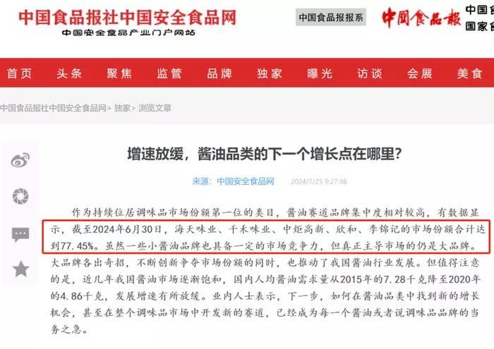 从市场占有率来看,海天味业依然是遥遥领先。据《中国安全食品网》7月25日报道,截至2024年6月30日,海天味业、千禾味业、中炬高新、欣和、李锦记在酱油市场份额合计达到77.45%,其中海天味业市场份额为15%。海天味业也曾在投资者平台回应称其市场占有率在13%至17%之间。