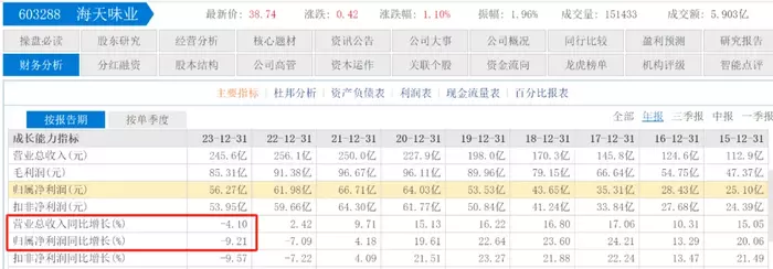 2023年,受2022年辛吉飞事件余波影响,这一年海天味业的营收和净利润出现了上市以来的首次双双下滑。