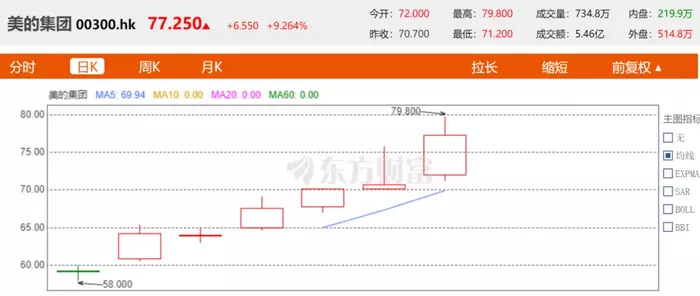 9月17日开盘股价报59.2港元,上涨8%,随后股价一度涨超9%,当日报收+7.85%,随后5个交易日一波连涨,截至9月26日收盘,美的集团股价报收77.250港元,较发行价涨幅30.5%。