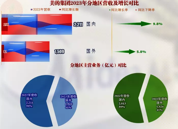 美的集团的海外市场表现优异,目前已经成为海外市场营收占比较高的家电企业。2023年海外市场营收占比达41%。通过海外不断并购高质量的企业,迅速完成全球市场的拓展,而此前巨资并购的企业,如今都已经逐渐显现回报。
