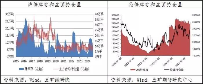 沪锌多头谨慎拉涨,伦锌多空增仓激烈博弈。沪锌盘面,8月中下旬,多头小幅增仓成功拉升价格至24280元/吨,受阻24000-25000元/吨压力区间;9月上旬,多头撤离导致锌价回落至22565元/吨但未创新低;9月中旬,空头减仓叠加多头增仓再度拉升锌价重回24335元/吨,再次受阻回落。伦锌盘面,8月下旬至9月上旬多空增仓博弈,多头主动拉升价格至2945美元/吨,之后空头持续增仓1.2万手带动价格跌至2679美元/吨,随后再次增仓2500手试图继续打压价格,但难以带动锌价进一步下跌;9月中旬多头大幅增仓8000手带动锌价重新回升至2977.5美元/吨。9月18日,沪锌收盘价23915元/吨,较上月同期23345元/吨上涨2.44%;伦锌收盘价2884美元/吨,较上月同期2790.5美元/吨上涨3.35%。