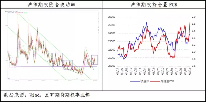 市场看涨情绪较强,预期锌价10月主要在22000-25000元/吨运行。沪锌期权隐含波动率从7月低位15.43%逐渐回升,9月18日报收于25.12%,位于历史中部偏低水平,市场认为锌价剧烈波动风险较低。从沪锌期权最大持仓量所在行权价来看,9月18日,zn2411合约看跌期权最大持仓量所在行权价为22000元/吨,看涨期权较大持仓量所在行权价为25000元/吨,市场预期10月锌价主要在22000-25000元/吨运行。从期权持仓量来看,9月18日,看跌期权持仓量54601手,较上月同期减少1798手;看涨期权持仓量29678手,较上月同期减少5300手;持仓量PCR报收于1.84,较上月同期增加0.23,市场看涨情绪增强。