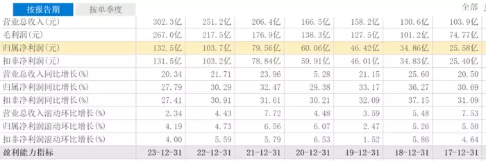 泸州老窖在2023年业绩表现不俗。财报显示,2023年泸州老窖的营收首次突破300亿元,达302.3亿元,同比增长20.34%;归母净利润达132.5亿元,同比增长27.79%。但2023年的营收和净利润增幅相比2021年和2022年有所放缓。2021年泸州老窖的营收增幅为23.96%,净利润增幅为32.47%;2022年营收增幅为21.71%,净利润增幅为30.91%。2023年的营收增幅在近9年中高于2020年的5.28%,同时净利润的增幅则是近9年中最低。