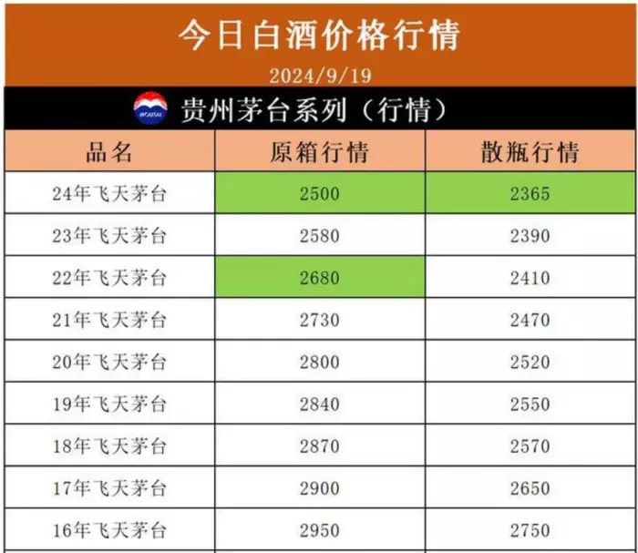 不只是茅台,白酒行业股价几乎都和茅台类似,五粮液在年内股价下跌18%,泸州老窖年内股价下跌超过40%……此前一直被视作“皇帝女儿不愁嫁”的飞天茅台,价格也一跌再跌。9月19日白酒价格行情显示,原箱价格为2500元/瓶,散瓶为2365元/瓶。据前茅台零售商李东伟介绍,2023年春节期间飞天茅台原箱价格每瓶超过3000还供不应求,散瓶也超过2800元。短短一年,飞天茅台的价格几乎每瓶下跌约500元。