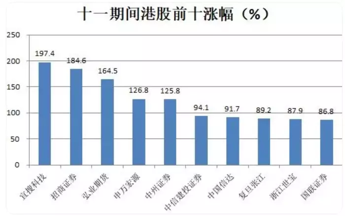 BT财经梳理了国庆节期间,港股上涨前十名企业,分别为宜搜科技、招商证券、弘业期货、申万宏源、中州证券、中信建投证券、中国信达、复旦张江、浙江世宝和国联证券。一个现象是这10家企业中,有8家同时也在A股上市,只有宜搜科技、中国信达不是A+H股。其中宜搜科技涨幅最高,以197.4%的涨幅位居港股涨幅之首,中国信达在此期间涨幅91.7%,位居涨幅第七位。