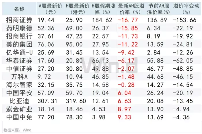 BT财经梳理后发现,目前A股+H股的上市公司共有149家,9月30日,所有AH股的A股价格都高于H股,但最新A股对港股的溢价率出现一定下滑。以10月7日数据为例,A股对H股整体平均溢价率为62.75%,较9月30日下降45.04个百分点。恒生沪深港通AH股溢价指数跌至4年新低。A股相对投资性价比大幅上升。10月7日,已经有9只H股价格高于A股。这9只股票分别为招商证券、药明康德、招商银行、美的集团、亿华通、华泰证券、中信证券、万科A和海尔智家,其中以招商证券溢价率最高。