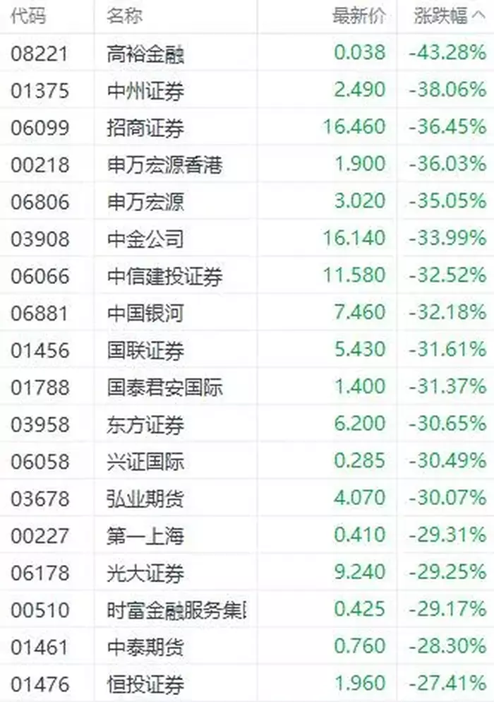 港股市场高开低走,跌幅较大,恒生指数跌幅一度接近10%,将节日期间的涨幅抹去。其中以金融类股跌幅最大,中资券商成为港股下跌最大动能,招商证券、东方证券、中金等知名券商,跌幅均超过30%。连中信证券这样的券商龙头跌幅也达23.54%。