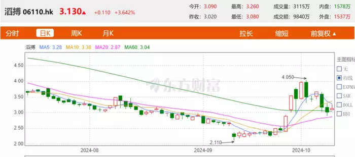 但是“运动鞋王”滔搏体育表现却格格不入,在国庆节后两个交易日,滔搏股价分别下跌13.62%和4.73%。而进入2024年以来,滔搏的股价整体跌幅明显,股价由年初的5.77港元一路下跌,整体跌幅约46%。和其股价高点的12.394港元相比,较高峰值股价跌幅达75%,市值蒸发了574.5亿港元。